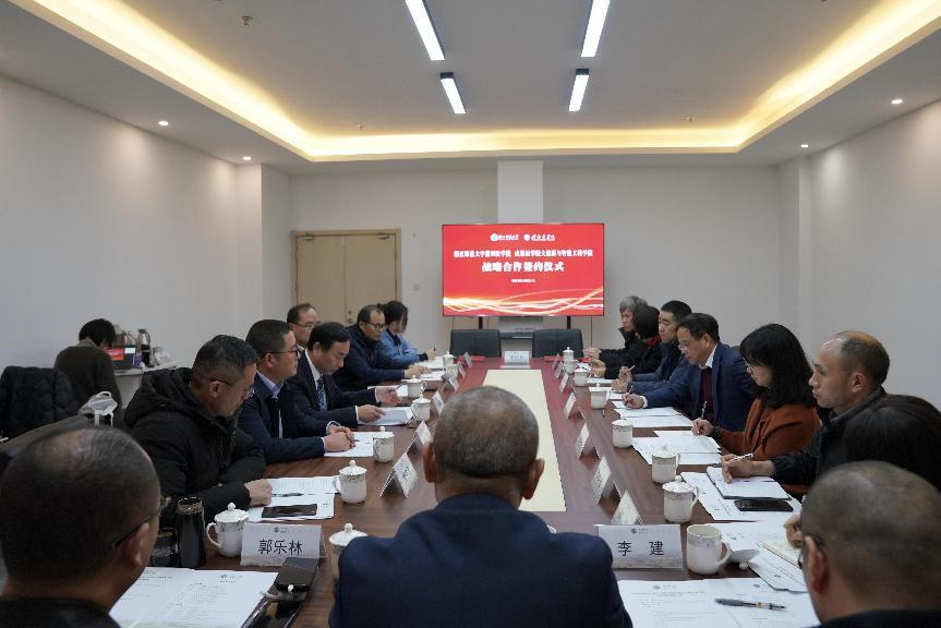 为进一步加强校际交流与合作,12月4日下午,浙师大数理医学院与成都医学院大健康与智能工程学院战略合作签约仪式暨产学研合作研讨会在数理医学院杭州创新研发中心举行。成都医学院校长潘克俭,副校长张涛,党委办公室、校长办公室主任闫凤娟,大健康与智能工程学院党委书记彭成静,大健康与智能工程学院副院长刘永贵,浙师大副校长张根福,数理医学院院长孔德兴,继续教育管理处副处长罗福建,数理医学院副院长黄守军等出席签约仪式。仪式由数理医学院党委书记杨锋主持。