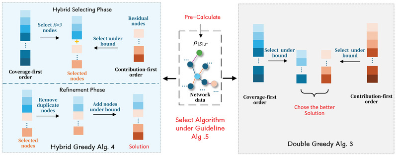 图1. 所提出用于求解MCLC问题的混合方法整体框架。该框架的核心是一个数据驱动的预判模块(中部)。通过计算Pearson相关系数,该模块对求解流程进行引导:当相关系数较大且为正时,激活HG方法(左);当相关系数较小或为负时,激活经典的双贪婪方法(右)。其中,HG方法融合了混合选择阶段与精细化优化阶段,以提升解的质量;双贪婪方法则分别评估“覆盖优先”和“贡献优先”两种启发式策略,并从中选择最终最优的节点集合。
