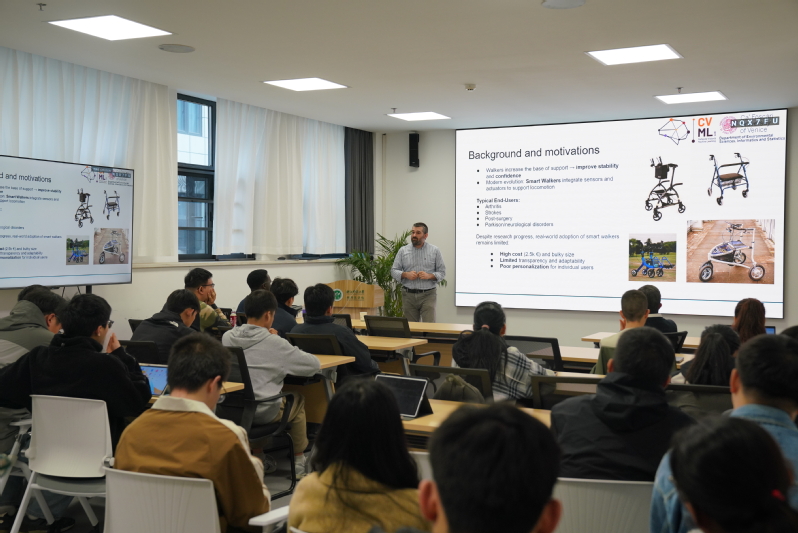 Sebastiano Vascon教授以自研的开放词汇3D目标检测和环境约束轨迹预测算法为核心,介绍了一套能够实时捕捉用户腿部动态并将其转化为平滑辅助动力的技术框架。该框架在零样本3D检测领域超越了现有最先进技术(SOTA),在无需预训练的情况下实现了高达 23-33 FPS 的处理速度,性能显著优于 2024 至 2025 年间的基准模型。通过引入环境碰撞损失函数与对比学习机制,该系统有效解决了传统轨迹预测模型容易穿透静态障碍物的通病,在保证实时避障的同时实现了极高的环境适配率。在此架构下,助行器不仅能智能识别社交群体并进行人脸匹配导航,还通过全本地化的 Jetson AGX 计算平台确保了极高的响应精度与隐私安全,为 2026 年即将开展的临床试验奠定了坚实的理论与技术基础。
