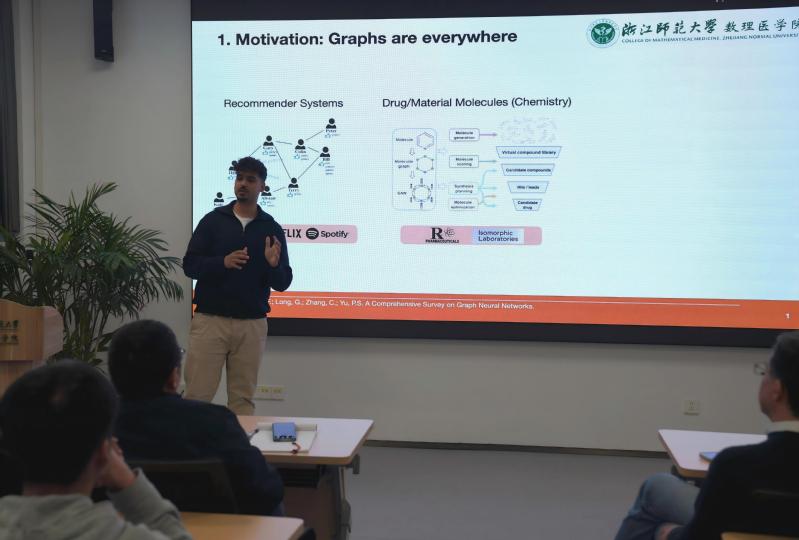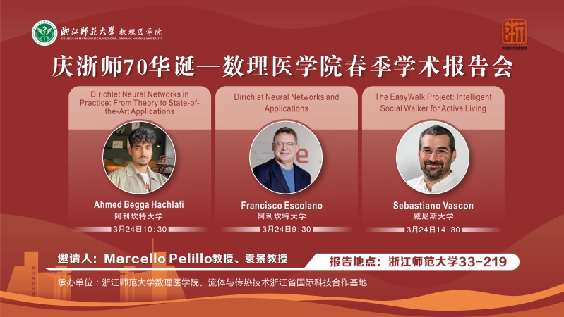 喜迎浙师70周年校庆,3月24日,由浙江师范大学数理医学院、流体与传热技术浙江省国际科技合作基地承办的春季学术报告会在33幢219会议室顺利举行。本次报告会邀请了来自阿利坎特大学的Ahmed Begga Hachlafi博士、Francisco Escolano教授以及来自威尼斯大学的Sebastiano Vascon教授分别作了题为《Dirichlet Neural Networks in Practice:From Theory to State-of-the-Art Applications》《Dirichlet Neural Networks and Applications》《The EasyWalk Project: Intelligent Social Walker for Active Living》的报告。