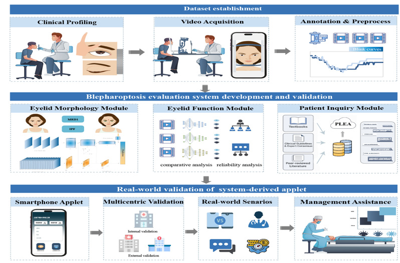 图1. 全流程示意图。采集先天性上睑下垂患儿的临床数据与眨眼视频。上睑下垂评估系统由三个关键模块组成:(1)眼睑形态评估模块,用于自动测量IPF和MRD1。(2) 提肌功能评估模块,针对功能异常患儿提供自动转诊建议。通过对比多种模型架构,验证了该系统在临床判别中的高可靠性。(3)领域自适应对话大模型,专为上睑下垂患儿定制,提供专业的咨询与交互。此外,基于上述模块,团队开发了手机端评估小程序,并在多中心数据集中完成了真实世界验证。临床分析显示,该程序在辅助患者自我健康管理及提升临床诊疗效益方面展现出巨大潜力。